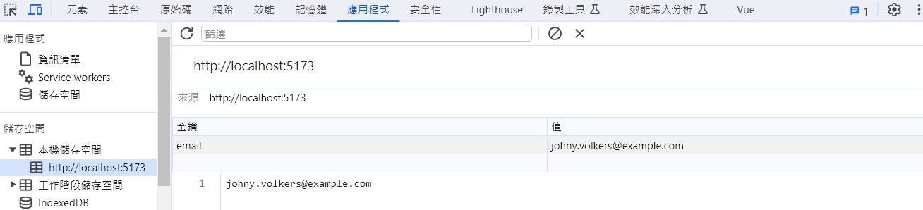 - 實際關閉網頁後再進入,觀察 localstorage 是否有存入一組 email。